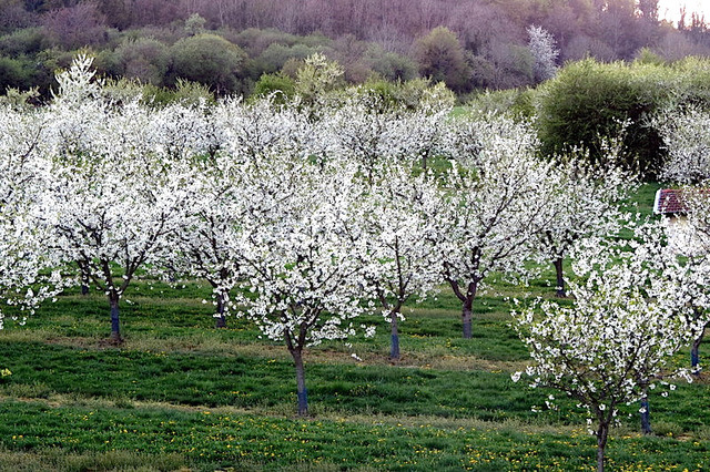 Les fleurs de cerisier sont joliment groupées en bouquets ronds.