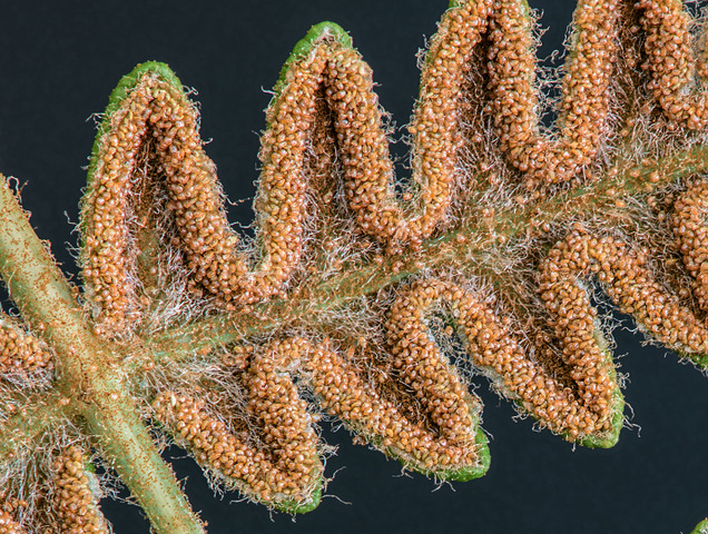 Certaines fougères sont des plantes épiphytes : elles poussent sur d'autres plantes, ici sur un tronc d'arbre, en compagnie de mousses. On aperçoit les sporanges à la face inférieure des frondes, une particularité des fougères.
