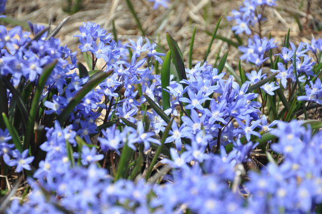 Hyacinthoides hispanica, la scille d'Espagne, est une bulbeuse qui forme vite de grosses touffes ; en mai, les nombreuses inflorescences bleu violacé, en épis lâches, se dressent au-dessus d'un feuillage rubané.