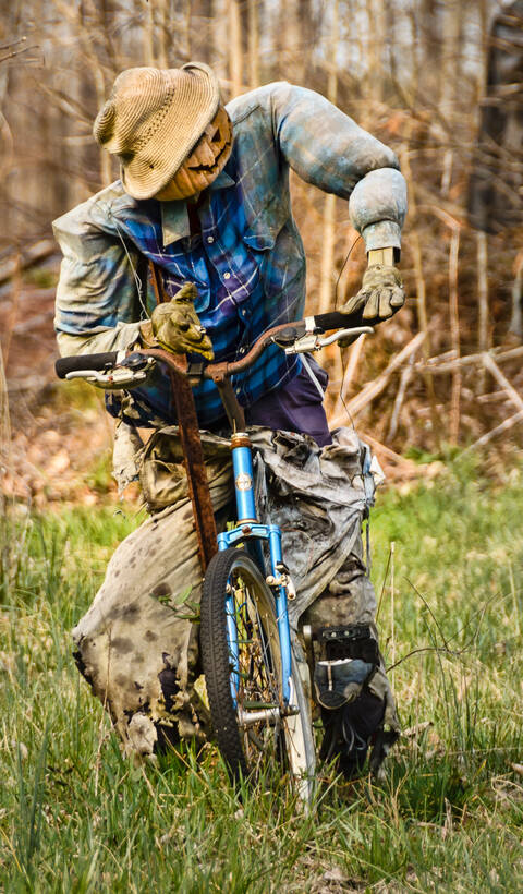 Sac plastique pour la silhouette de cet épouvantail très "agricole",, et rubalise pour l'animer : les oiseaux se sont-il risqués à venir se servir avant la levée du semis ?
