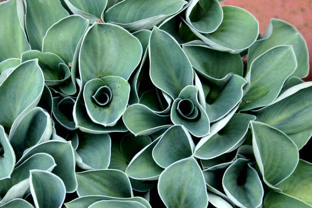 Très originale, cette variété se distingue par son feuillage au centre vert-jaunâtre bordé de deux larges bandes vert-bleuté foncé. Un liseré blanc et irrégulier, comme tracé au pinceau, vient séparer les deux couleurs.