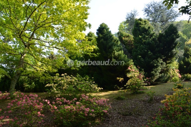 En mai, les rhododendrons se partagent la vedette avec les azalées, les magnolias et les camélias. Les rhododendrons sont aussi beaux de loin, grâce à leurs floraisons époustouflantes, que depuis leur pied, où l'on peut admirer leur ramure tortueuse.