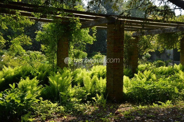 Au premier plan, le feuillage du mélèze doré de Chine (Pseudolarix amabilis) le dispute en finesse et en légèreté à celui du chêne à feuilles de saule (Quercus phellos), au 2e plan.