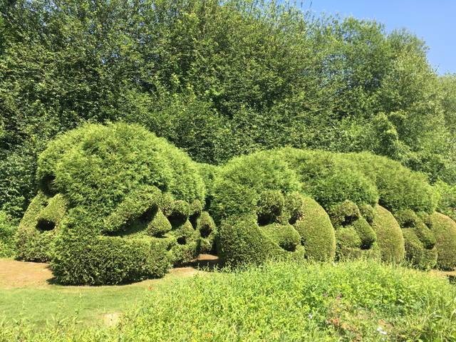 Une autre vue du Jardin Guerrier, avec des ifs dorés qui moutonnent au premier plan, contrastant avec le port fastigié des autres.