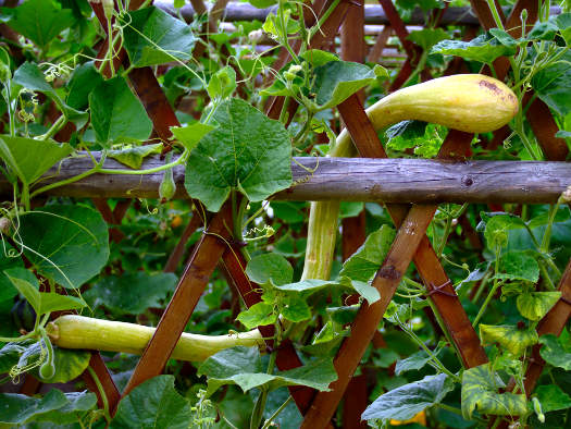 Le potager est aussi un lieu de créativité, où l'organisation nécessaire de l'espace donne libre cours à l'imagination des jardiniers. Ici, le besoin de porter certains végétaux à la verticale a conduit à la fabrication de structures métalliques en fers à béton. Ils sont durables et remplissent bien leur rôle de support de culture. L'approche est pragmatique mais aussi esthétique puisque le côté brut de ce matériau répond idéalement au bois des planches de bordure.